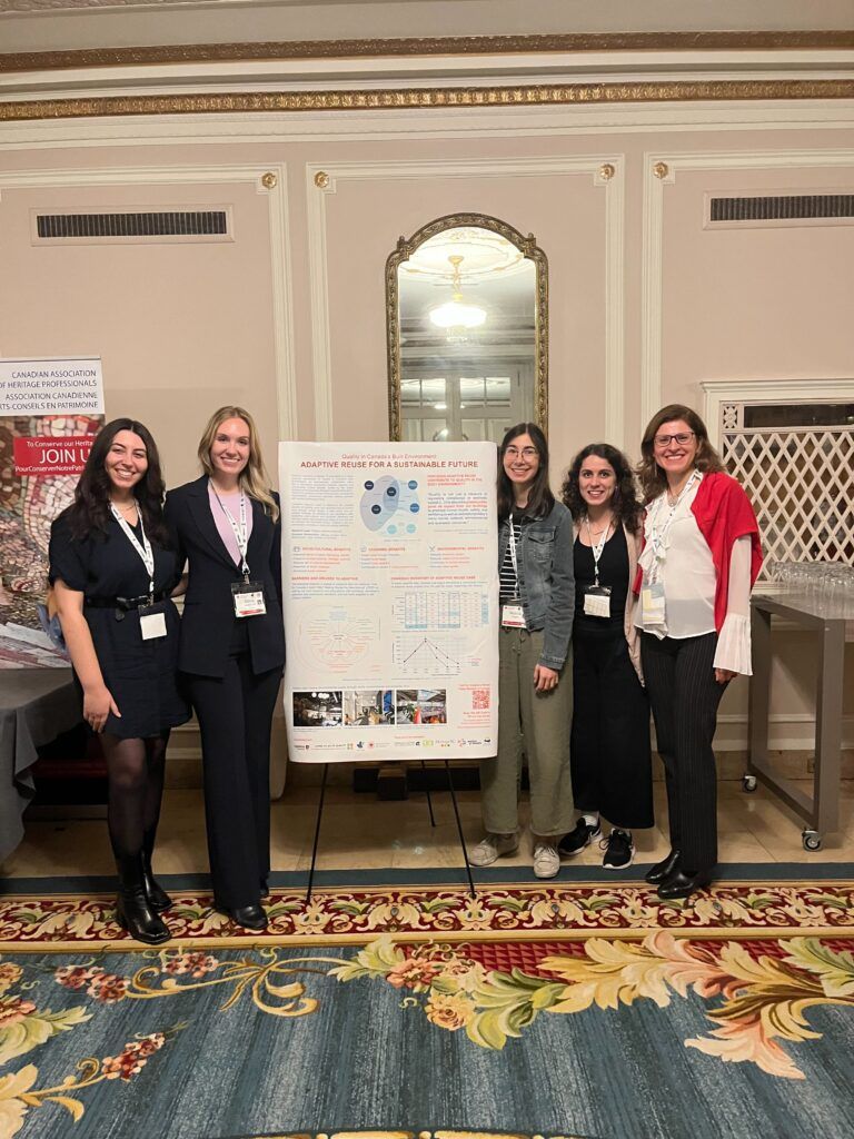 In addition to participating in the CAHP Workroom on Adaptive Reuse and Climate Action, a collaboration between Carleton x CAHP, on the first day of the conference, Carleton’s research on adaptive reuse was more formally highlighted by Prof. Mariana Esponda as one of the panelists during a session titled Transforming the Business of Heritage. We are also proud to have had the culmination of our first year of SSHRC-funded research on Adaptive Reuse for a Sustainable Future on display in the main hall for the duration of the conference (shown below).