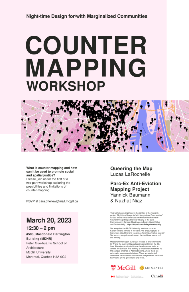 Please, join us for the first of a two-part mapping workshop featuring members from “Queering the Map” and the Queering the Map” et du “Parc-Ex Anti-Eviction Mapping Project RSVP with Cara Chellew (cara.chellew[at]mail.mcgill.ca) by March 15th.