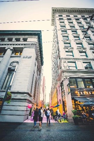 In 2015, the Downtown Vancouver Business Improvement Association (DVBIA) conducted ‘Re-imagine Downtown Vancouver 2040,’ a collaborative visioning process. Public space emerged as a major theme; 11,000 Vancouverites said they wanted “more public space, including plazas, rooftop patios and alleyway activations”. hcma partnered with the City and the DVBIA to transform alleyways from utilitarian service corridors into bright, playful public spaces. These spaces are shared by people and vehicles, which continue to access the lane from service purposes.