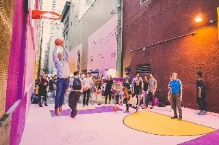 Each laneway transformation has an identity and theme in contrast with its surrounding area. In juxtaposition to its location in the heart of the business district, the reimagined Alley-Oop laneway is themed “Play”. Bold pink and yellow paint, basketball hoops and furniture act as a beacon to those working in Vancouver’s business quarter, encouraging them to play, exercise and socialize in the space.