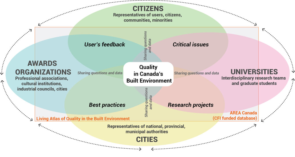 For the first time and at an unprecedented scale in the design disciplines in Canada, the project gathers 14 universities including all of the schools of architecture as well as most landscape architecture and environmental design departments. It mobilizes 23 disciplines concerned with the impact of built environments on citizens. Sixty-eight partner organizations including national institutions and not-for-profit join in a conversation pertaining to 4 thematic clusters to address urgent considerations on quality relative to: