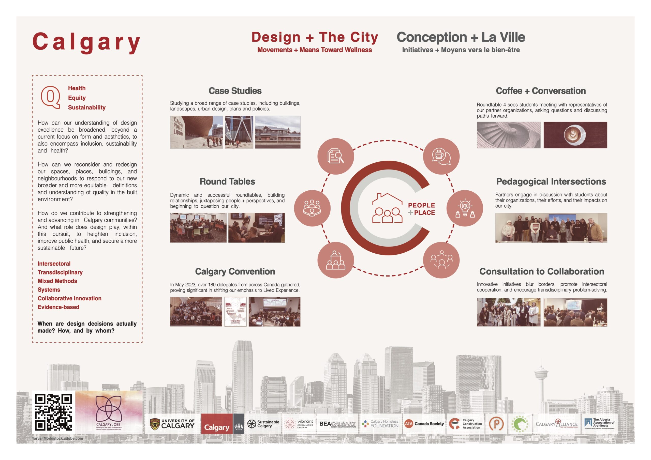The initiative, led by Calgary University “Design + The City,” explores how urban design can enhance wellness, equity, and sustainability in urban environments. Central to this initiative is the integration of “People + Place,” which underscores the importance of the relationship between communities and their surrounding environments in shaping urban health and quality of life. The initiative adopts a multifaceted approach that includes case studies, round tables, conventions, and coffee + conversation sessions to encourage discourse between citizens and professionals. It bridges the gap between theory and practice while pedagogical intersections explore the educational impacts of design.