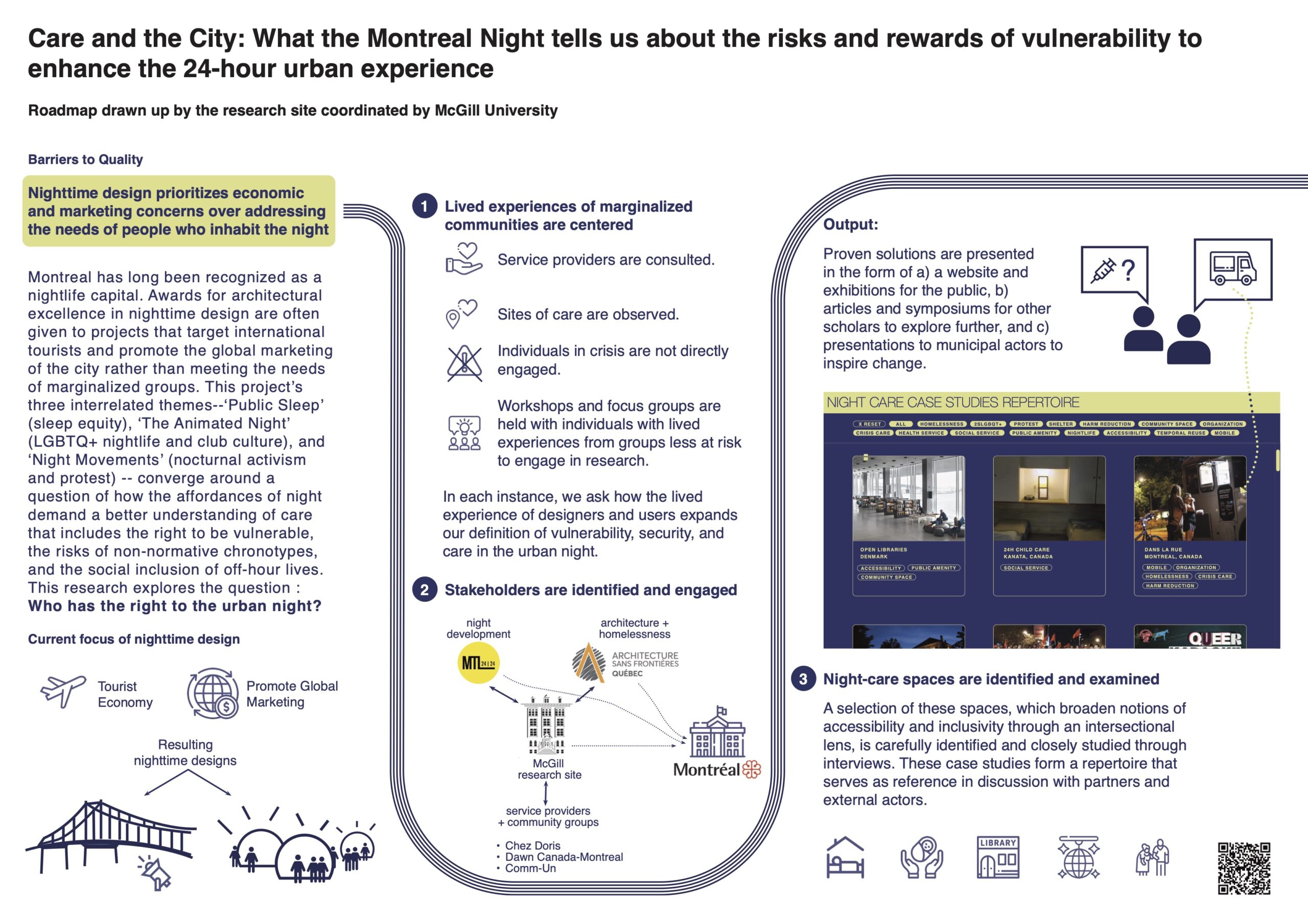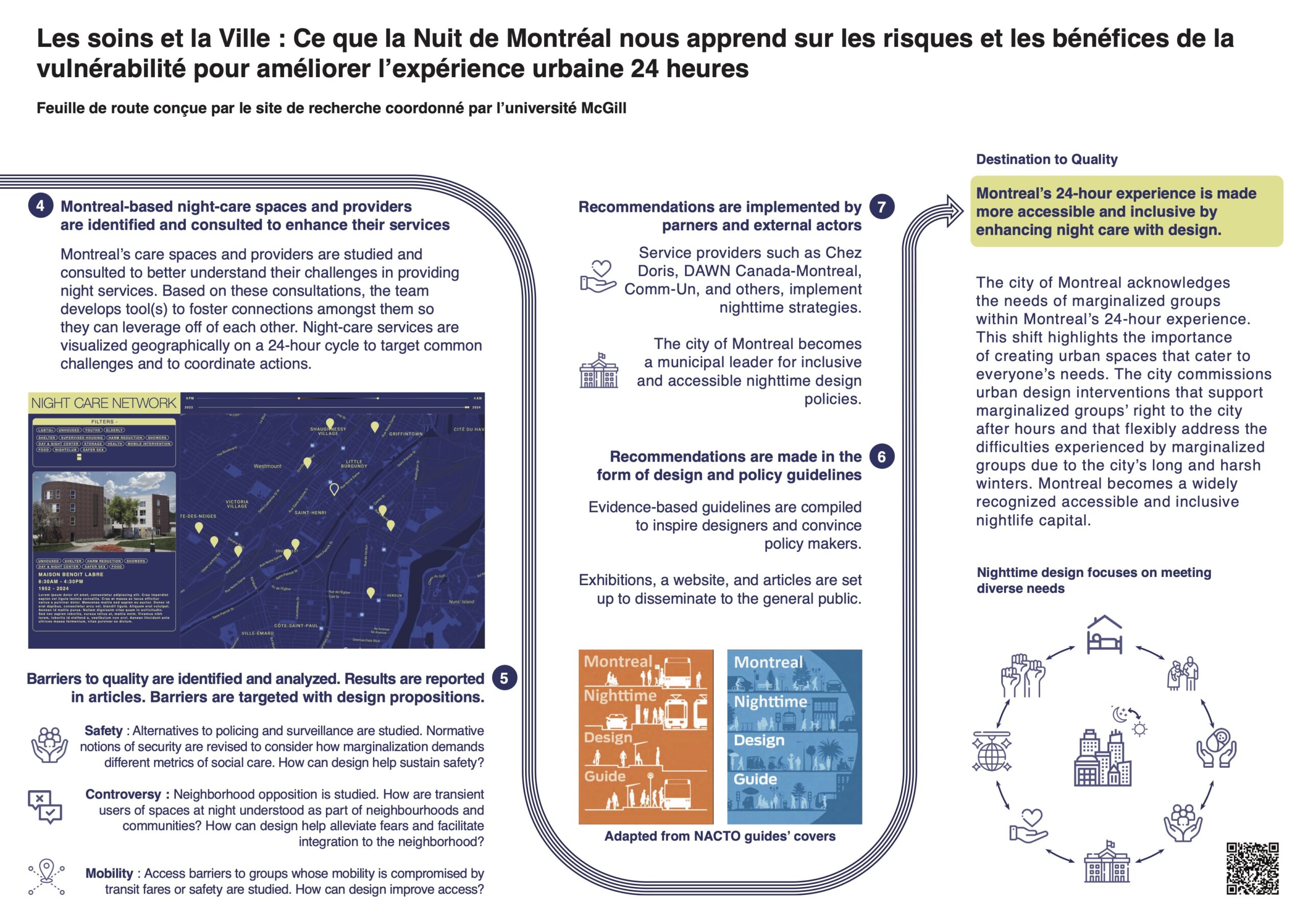 The project emphasizes the lived experiences of marginalized communities, engaging with stakeholders, and identifying night-care spaces that broaden notions of accessibility and inclusivity. By consulting with service providers and communities, the roadmap identifies barriers to quality in nighttime care and explores how these can be addressed through design interventions. The roadmap also explores the design and policy guidelines for enhancing the inclusivity and accessibility of Montreal’s 24-hour urban experience, recognizing the diverse needs of its residents and ensuring that nighttime spaces are safe, welcoming, and accessible to all, particularly those most vulnerable.