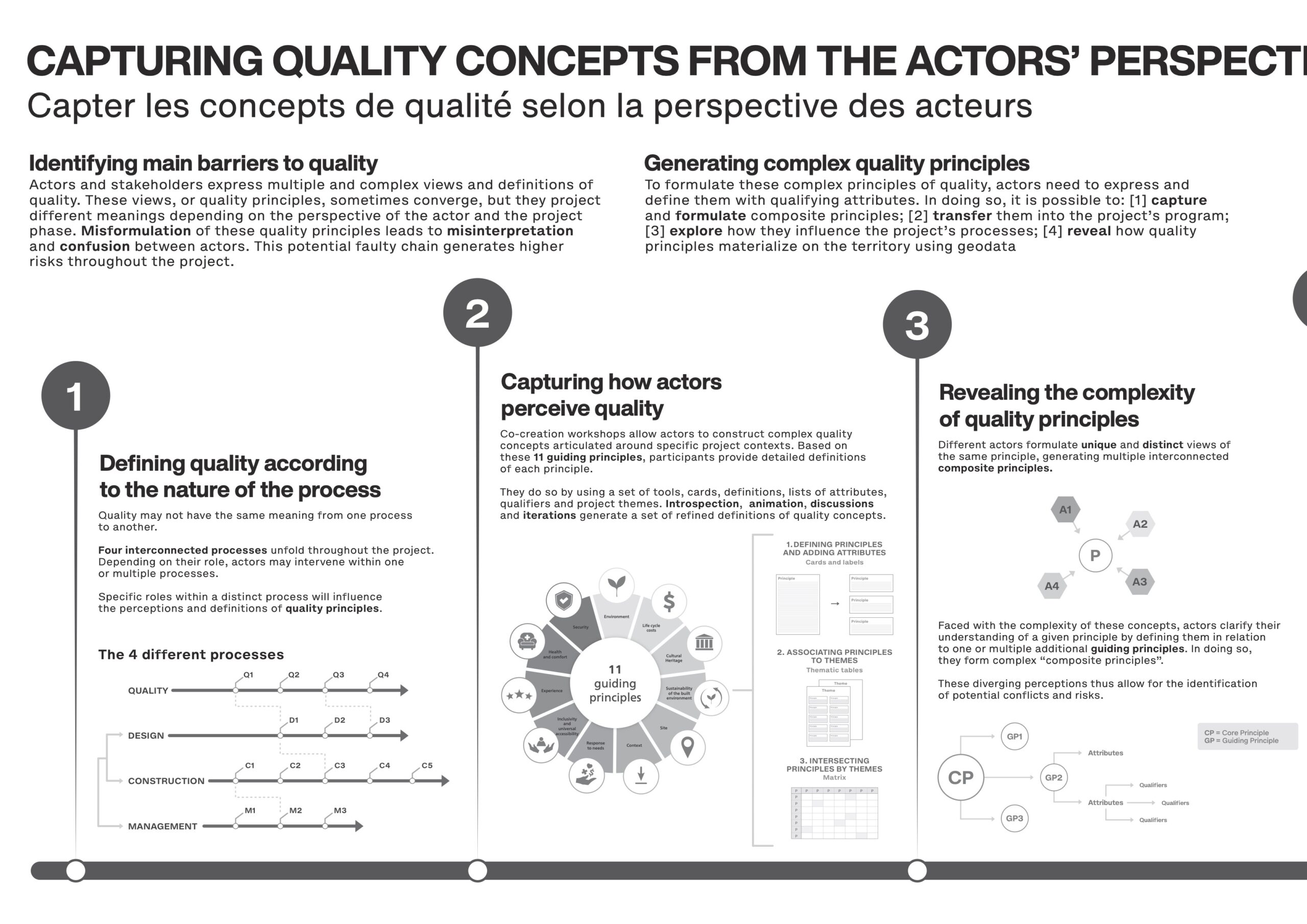 The initiative led by Université Laval emphasizes the critical barriers to understanding and implementing quality in urban development. The roadmap begins by identifying these barriers, including definitions of quality. In the second stage, the roadmap explores how different stakeholders, including users, designers, and policymakers, perceive quality within the context of urban development. This phase involves gathering and synthesizing diverse views to develop a more comprehensive understanding of quality in the built environment. The roadmap also focused on developing nuanced, composite principles to address the complex and often conflicting views of quality identified earlier.