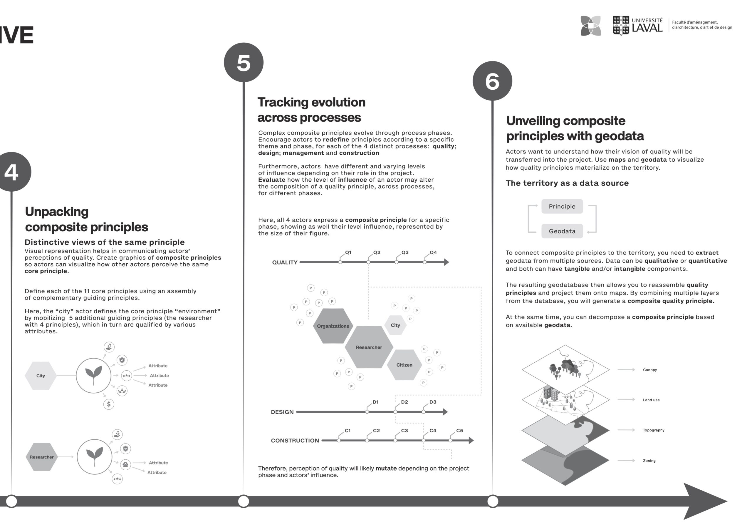 In the subsequent phases, the focus will be on formulating intricate quality principles encompassing the diverse perspectives gathered during the initial stages. These principles will ensure their feasibility and applicability to specific projects. Furthermore, there will be an emphasis on tracking the evolution of these quality principles and integrating geospatial data to unveil comprehensive patterns and insights.