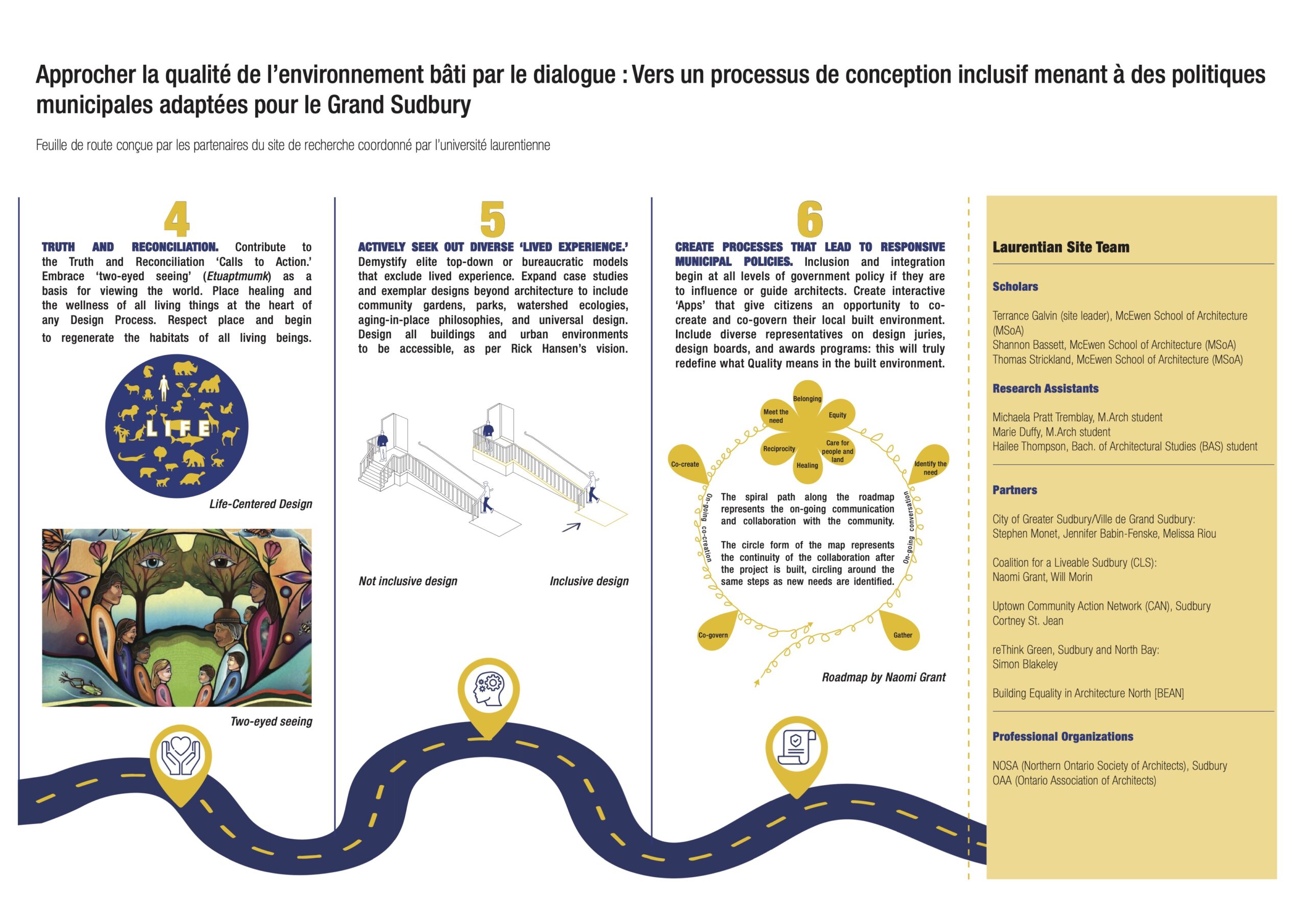 The initiative led by Laurentian University focuses on improving the quality of the built environment in Greater Sudbury through an inclusive design process that fosters responsive municipal policies. The roadmap identifies six main barriers to quality, including gathering community input, building strong relationships among stakeholders, co-creating solutions, and embracing truth and reconciliation principles. The approach emphasizes the importance of listening to the lived experiences of residents, particularly those from marginalized groups, to ensure that design decisions reflect the diverse needs of the community.